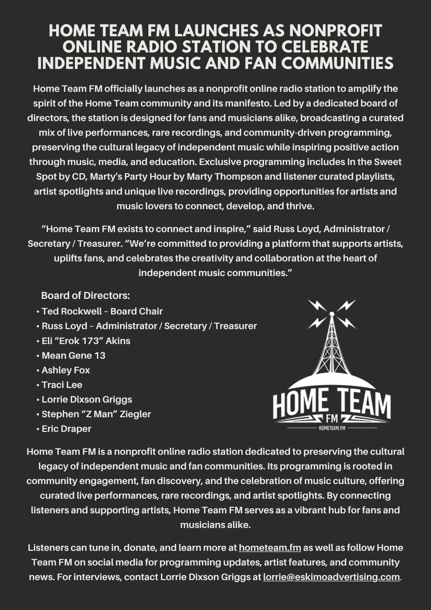 “Home Team FM exists to connect and inspire,” said Russ Loyd, Administrator / Secretary / Treasurer. “We’re committed to providing a platform that supports artists, uplifts fans, and celebrates the creativity and collaboration at the heart of independent music communities.”