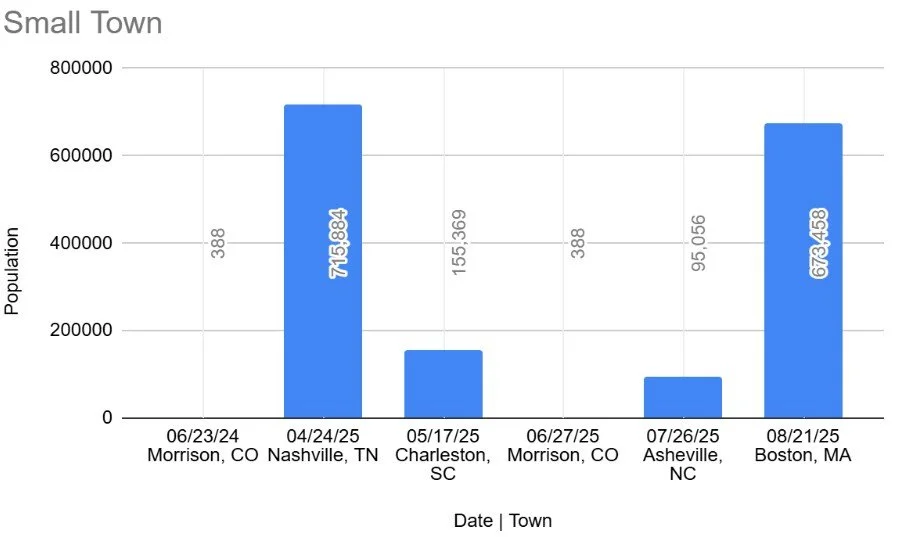 Jimmy’s flawless guitar work along with some reassuring piano led us into a very new song, Small Town. We here at Watlow HQ are particularly fond of the central character named Lucky in this song and support him even if he’s not the best driver in town. We love a good crime spree, yet believe that stopping at green lights can be dangerous. As much of the Panic fan base hails from small towns, undoubtedly the story and lyrics of this song hit home when your place of origin is a wee map dot. Jimmy played this like a new pop song and sounded very sharp and composed. JB’s vocals were on point and then it all dropped into a bit of freeform at about 4:30. Approximately two minutes of fine improvisation set us up for a top shelf segue into another new song: Tacklebox Hero. This was easily the best ever segue in between these two particular new songs. With this being only the 6th time ever Small Town was played, it was also the first time it was followed by Tacklebox Hero. Here’s a list of the other times played, with the song that followed, PLUS a graph (NERDS!) indicating the population of each town it’s been played in. Surprisingly, Boston is not the largest town Small Town was played in, that was Nashville!