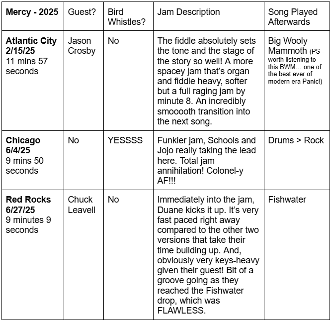 Mercy was pretty, as usual, and the keys were great. Let’s deep dive into Mercy a bit here… a song that hasn’t seen too much action in the most recent era (Duanespread Herring). It was played a total of three times in 2018, 2019, 2021, 2022, and 2023. It’s already been played three times in 2025, even though their tour is only about halfway finished, each one taking place in the second set. Honestly, they can play Mercy a dozen times each year and you wouldn’t hear a peep out of WATLO HQ staffers. Regardless, let’s break them down:
